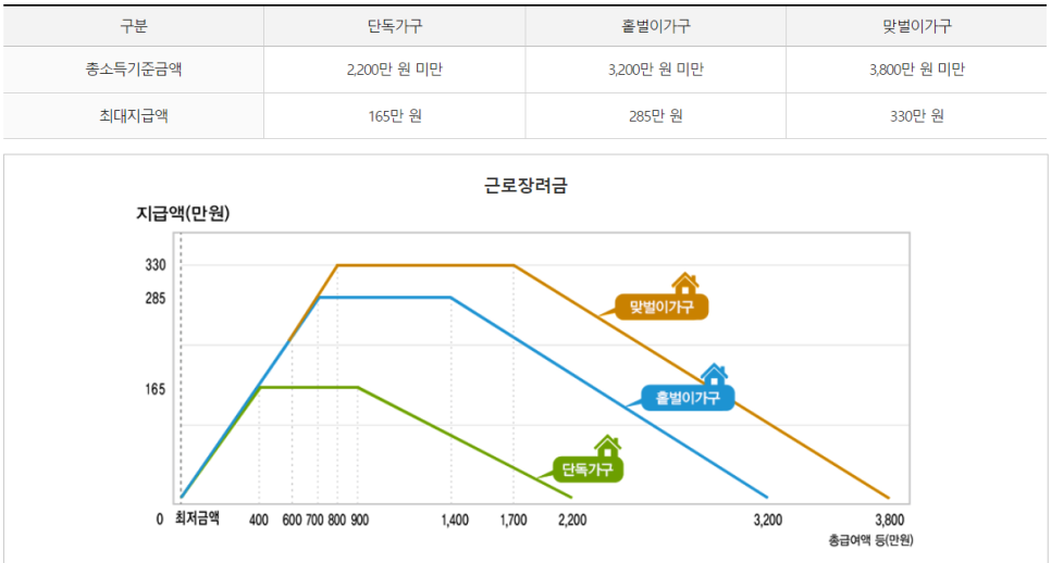 1인 가구는 물론 결혼 후 맞벌이를 하더라도 소득 기준에 해당한다면 최대 330만 원까지 받을 수 있는 근로장려금!