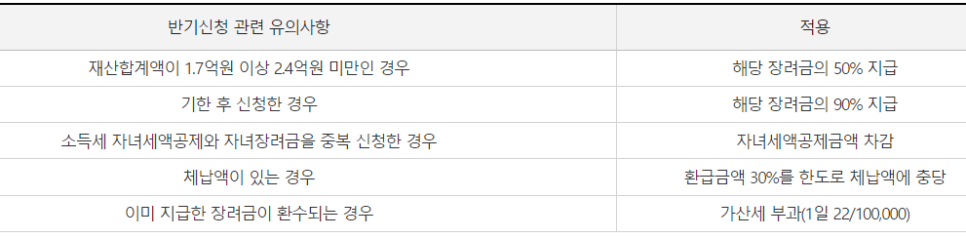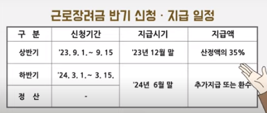 지급일 상반기, 하반기로 구분하여 상반기는 9월 중, 하반기는 3월 중 한 번만 신청할 수 있으며 신청대상은 근로소득만 있는 거주자(배우자 포함)로서 소득기준과 재산요건을 충족한 경우에 대상자가 됩니다.