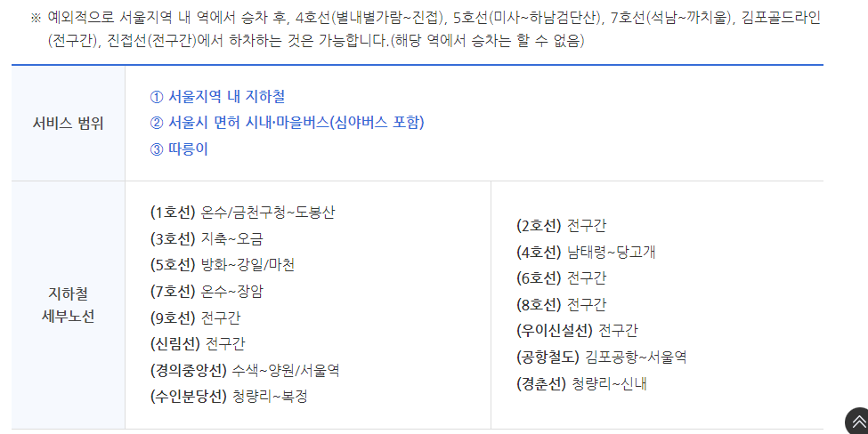 기후동행카드는 조건에 상관없이 서울지역에 있는 지하철과 버스, 따릉이를 충전 후 이용할 수 있기 때문에 거주지 조건은 따로 없습니다. 하지만 여기서 알아두셔야 할 점은 버스의 경우 서울시 면허 버스는 서울지역 외에서 승하차하더라도 기후동행카드를 사용할 수 있지만, 경기도 면허 버스라면 사용이 불가능합니다. 그리고 지하철도 주의할 점이 서울지역의 역에서 승차하더라도 그 외의 지역에서 하차할 때에는 기후동행카드를 사용할 수 없으니 본인의 이동경로나 출, 퇴근 지역을 잘 파악한 다음 신청하셔야 합니다. 좀 더 자세한 내용은 이미지를 통해 참고하실 수 있고 그 외에 애매한 지역은 직접 역을 검색해서 확인할 수 있습니다.