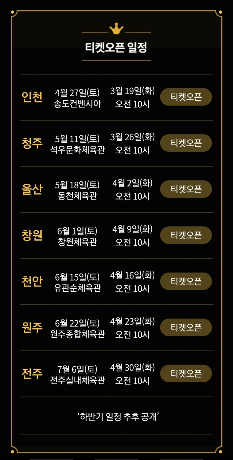 서울에서 라스트 콘서트의 마지막 무대가 이루어지지 않을까 짐작해 보지만 아직 확실하지 않다. 일단 서울 일정은 나오지 않았으니 가장 가까운 인천과 천안 티켓팅에 도전해 봐야 할 듯. 예매는 2024년 3월 19일(화) 부터 순차적으로 오픈 예정이고 그동안 오전 10시에 예매 링크가 열렸으니 참고하세요~
