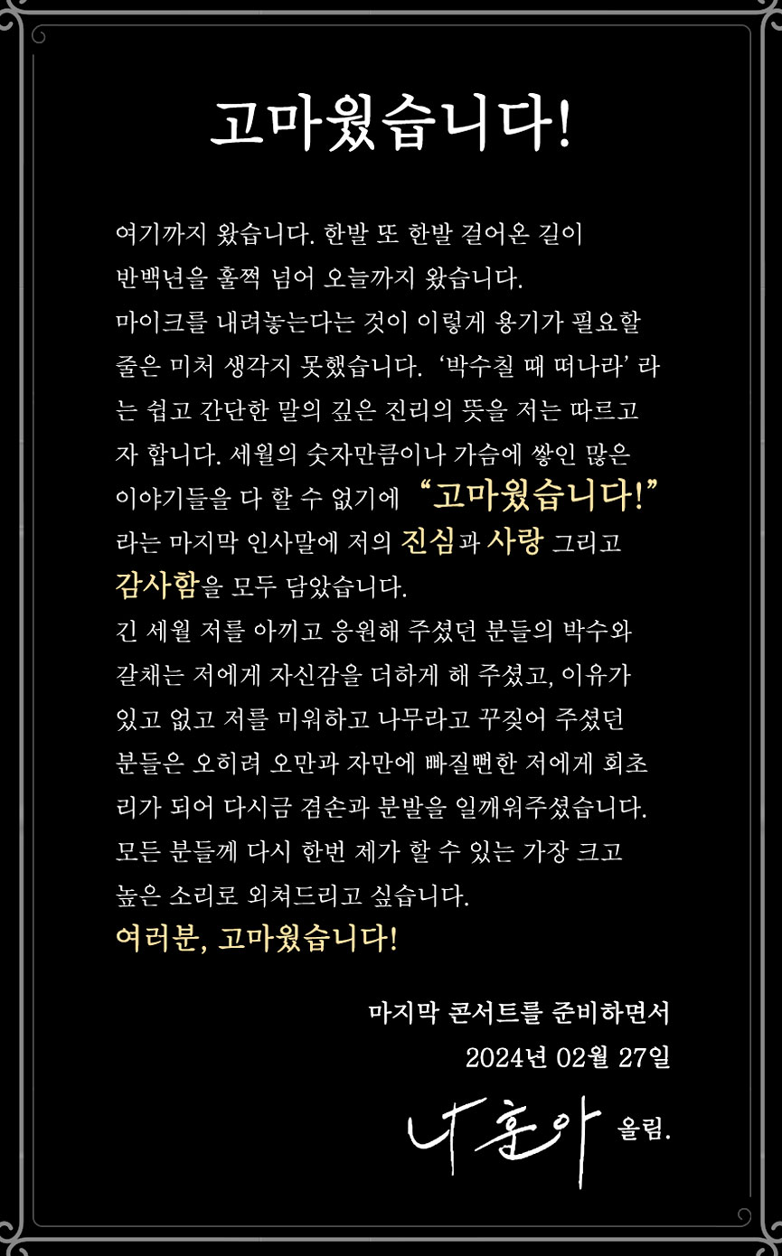 데뷔 58년만에 마이크를 내려놓는다고 밝힌 가수 나훈아는 소속사를 통해서 고마웠습니다라는 편지 한 통을 공개했습니다. 손뼉 칠 때 떠나려고 한다는 말의 깊은 진리를 따르고자 한다고 말했습니다. 팬들은 아쉬움이 크고 믿을 수 없다는 반응과 함께 마지막 은퇴 콘서트를 놓칠 수 없다는 반응입니다. 2024 나훈아 라스트 콘서트 예매는 아래 참고하시면 하실 수 있습니다. 다만 경쟁률이 매우 심할 것 같습니다.