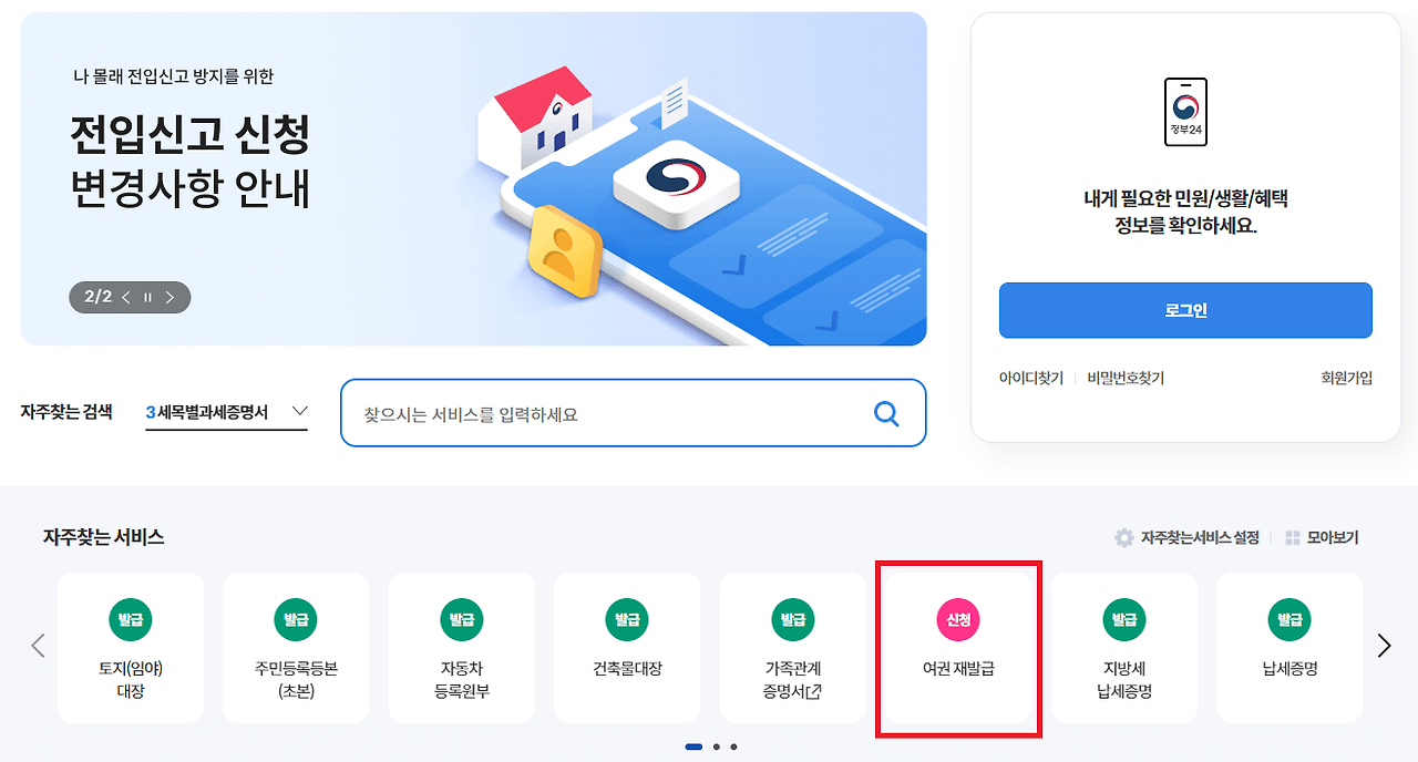 정부24홈페이지 에서 자주찾는 서비스▶여권재발급을 검색합니다
