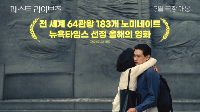 이처럼 영화 패스트라이브즈는 지난해 제39회 선댄스영화제에서 월드 프리미어로 상영되어 호평을 받았고, 세계 3대 영화제 중 하나인 제73회 베를린 국제영화제 경쟁 부문에 초청되며 작품성을 인정받았을 뿐만 아니라 제81회 골든 글로브 시상식 작품상 포함 5개 부문 노미네이트, 제77회 영국 아카데미(BAFTA)상 3개 부문 노미네이트, 제58회 전미 비평가 협회상 작품상 수상, 제33회 고담 어워즈 최우수 작품상 수상 등 권위 있는 시상식에서 호평을 받으며 세계적인 화제가 되고 있는 작품으로 3월 6일 국내 개봉일이 기다려집니다.