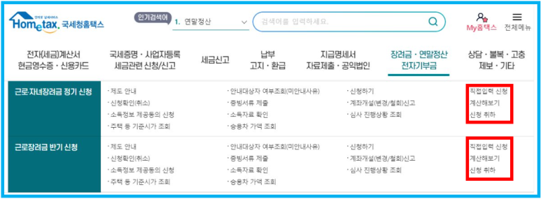 직접 손으로 계산하지 마시고, 홈택스에 들어가면 계산기를 통해 계산을 해볼 수 있습니다. 따라서 홈페이지에 접속해서 위의 메뉴로 들어가면 계산기를 켜서 계산을 할 수 있습니다. 여기서 직접 계산을 해보면 정확히 내가 얼마를 받을 수 있는지 확인할 수 있습니다.