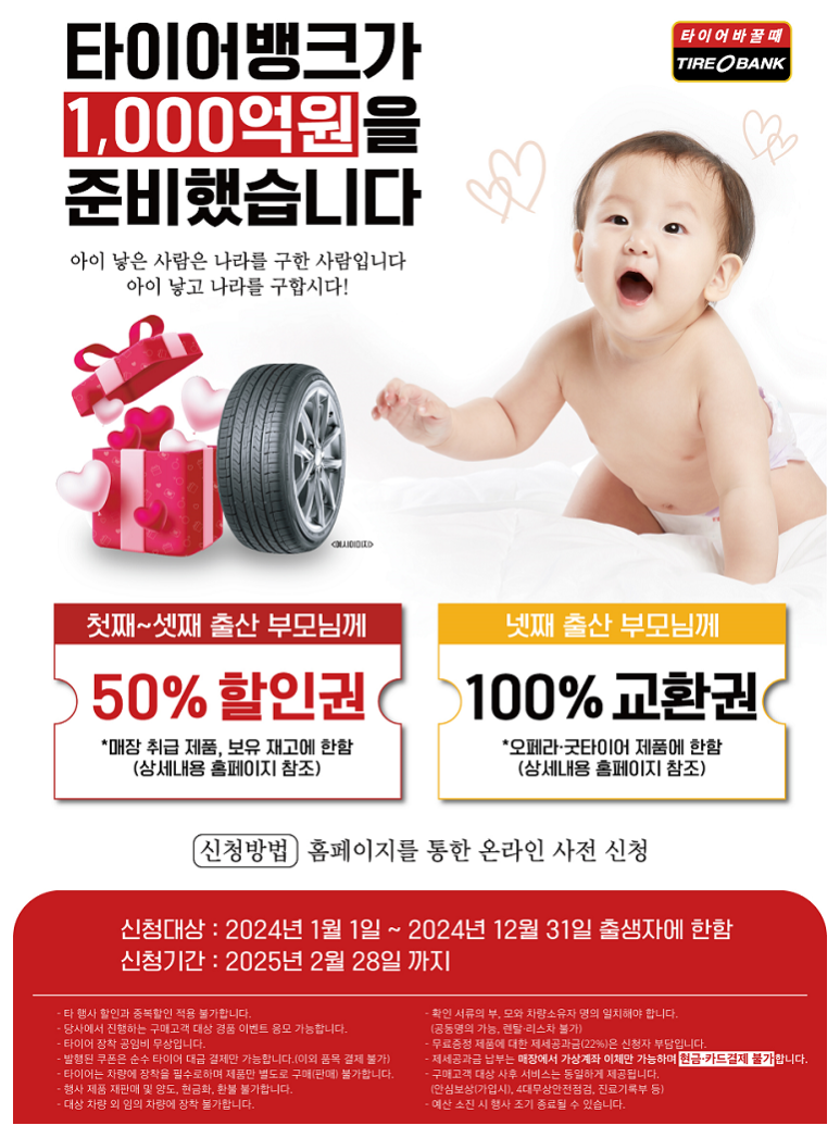 이상 타이어 뱅크에서 진행되고 있는 출산장려 이벤트 소식에 대해 알아보았습니다.