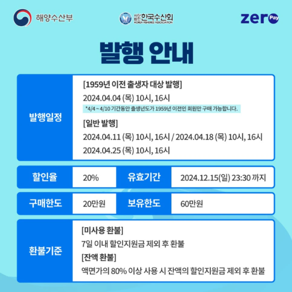 4월, 매주 목요일 아침 10시 오후 4시! 싱싱한 국산 수산물을 20% 할인된 가격으로 만날 수 있는 기회가 찾아왔습니다. 바로 대한민국 수산대전 상품권입니다. 4월 한 달 동안 매주 목요일 두 번씩 발행되는 이 상품권은 온 가족이 함께 즐길 수 있는 풍성한 해산물을 저렴하게 즐길 수 있는 좋은 기회입니다